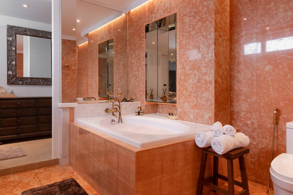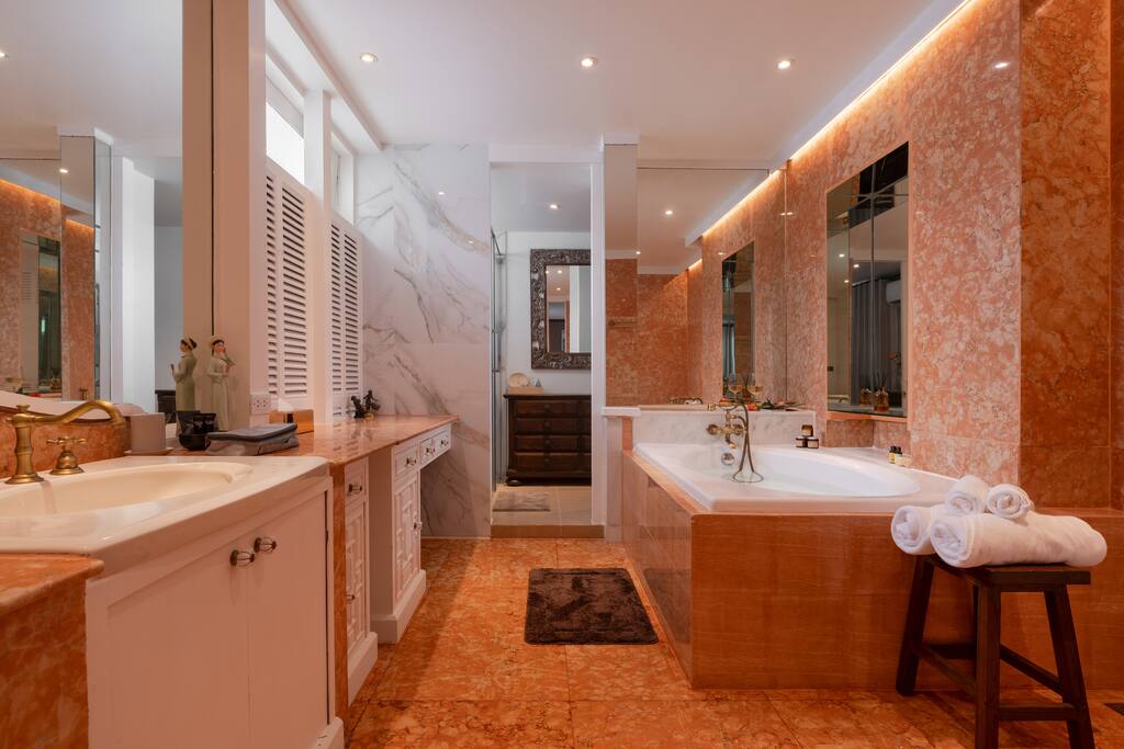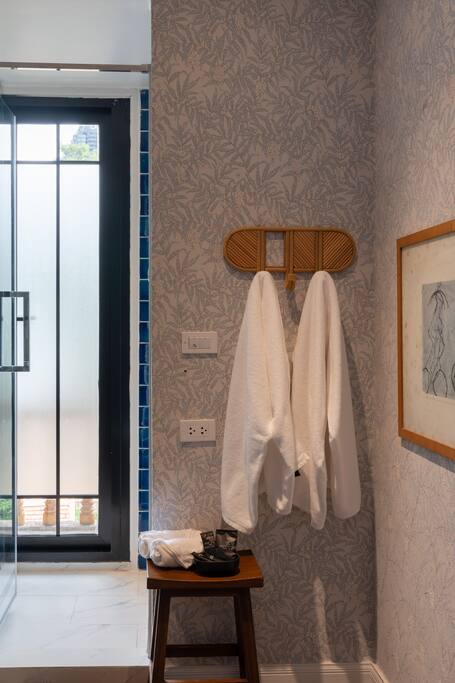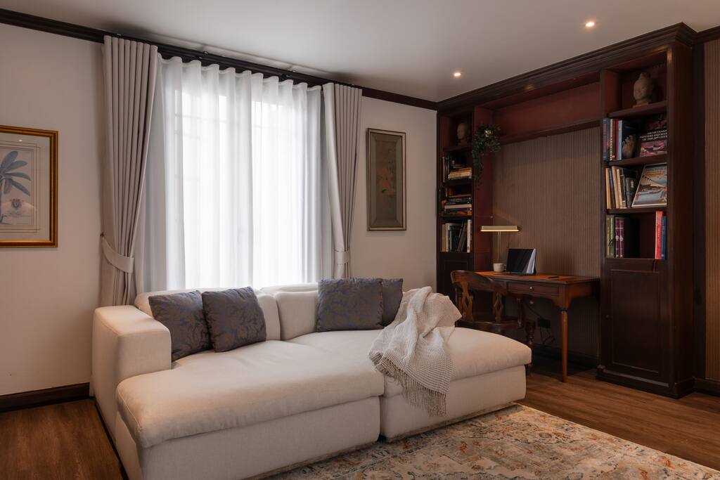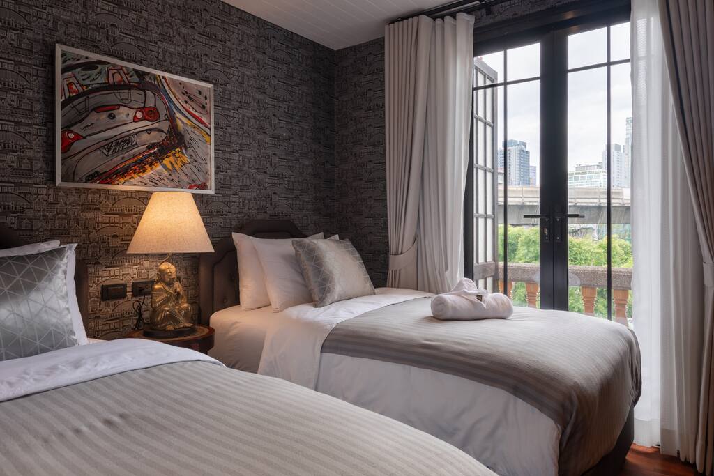 ✾ PROPERTY HIGHLIGHTS ✾ 🛋️ Oversized Living Room Relax, work, or entertain in this spacious, sun-filled living area – perfect for families or gatherings with friends. ✔ Open, airy layout with plenty of natural light ✔ Large coffee table for movie nights or board games ✔ 85” Smart TV with Netflix & ultra-fast 500Mbps Wi-Fi ✔ Dining table seating up to 6 guests ✔ Multiple cozy seating areas for every mood ⸻ 🛏️ MASTER HAVEN – King Suite Indulge in comfort and style in the master bedroom designed for pure relaxation. ✔ King bed with luxury mulberry silk pillows (perfect for hair & skin) ✔ Italian marble bathroom with spa-inspired round bathtub ✔ Private lounge sofa & Smart TV for movie nights ✔ Full-length mirror, vanity area & workspace with desk and chair ✔ Hair dryer, iron, and ironing board included ⸻ 🛏️ Twin Bedroom Perfect for families or friends traveling together. ✔ Twin beds with personal wardrobes ✔ Dedicated workspace with desk & chair ✔ Full-length mirror & dressing area ✔ Hair dryer, iron, and ironing board included ⸻ 🍽️ Fully Equipped Kitchen & Sunroom Cook, chat, or simply unwind in the sunlit kitchen with central island. ✔ Induction stove, coffee maker, toaster, blender, juicer & more ✔ Full cookware set and basic cooking essentials ✔ Sunroom lounge area & outdoor dining for two ✔ Open-plan layout with central island & stool seating ⸻ 🛁 Spa-Like Bathrooms Your private retreat after exploring Bangkok. ✔ Full-size bathtub with complimentary bath salts ✔ Fluffy towels, robes & toiletries provided ✔ Hot & cold water in both bathrooms ✔ Relaxing ambiance for a spa-like experience 📍 Prime Thonglor Location Only 3 minutes to BTS Thong Lor, you’re surrounded by Bangkok’s trendiest cafés, restaurants, and nightlife. Close By: • 🍽️ Food & Drinks: Top Japanese restaurants, cafés, and bakeries within walking distance • 🛍️ Shopping: The M-District (EmSphere, EmQuartier, Emporium) for luxury shopping & dining • 🏋️♂️ Fitness & Wellness: Muay Thai, yoga, Pilates, spas, and Bangkok’s top climbing gym nearby • 💎 Local Gems: Jouer – a charming creative hub just steps behind the property, featuring curated coffee shops and unique boutiques for a perfect afternoon escape. ⸻ 🏯 About the Home Designed by celebrated architect John Rifenberg in the 1970s for one of Bangkok’s elite families, this heritage penthouse combines architectural history with modern comfort. Newly renovated and art-filled, it offers a unique cultural stay in Sukhumvit’s most dynamic neighborhood. ⸻ Why Guests Love It ✔ Top-floor privacy in a heritage building ✔ Hot tub & spa access for total relaxation ✔ Daily housekeeping & airport pickup available ✔ Vibrant nightlife, dining & culture at your doorstep