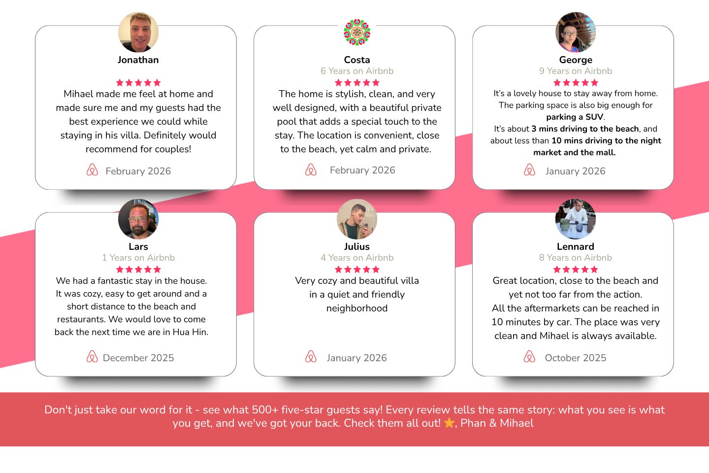 🏡 Ubicada a solo unos pasos de las arenas de la costa de Hua Hin, tu propiedad ofrece un refugio tranquilo para pequeños grupos que buscan relajarse. Esta villa privada con piscina captura la esencia de la vida junto a la playa con su diseño espacioso, que incluye dos acogedoras habitaciones, una queen y una king, asegurando comodidad para todos los huéspedes. La cocina está completamente equipada con todos los esenciales necesarios para cocinar, desde electrodomésticos hasta una selección de utensilios. Ya sea que prepares un desayuno rápido o una cena, el espacio es adaptable y cuenta con estufa de gas. Junto a la cocina, el comedor ofrece un espacio acogedor donde los huéspedes pueden reunirse y disfrutar. 🍴 Gastronomía y ocio La proximidad de la propiedad a cafés y restaurantes frente al mar significa que nunca estarás a más de 5 minutos en coche de una comida con impresionantes vistas al mar. Para quienes deseen explorar aún más la vibrante cultura gastronómica de Hua Hin, el Mercado Nocturno Queens Park está a solo 2 minutos en coche y ofrece una variedad de delicias locales. 🏊 Comodidades Tu propiedad no solo promete una estancia cómoda; te invita a disfrutar de sus comodidades. Una pequeña piscina privada y apartada es un oasis sereno, ideal para tardes tranquilas o para pasar tiempo de calidad con tus seres queridos. Para los huéspedes más activos, mantenerse conectados es fácil con el rápido WiFi de 500MB y AIS Play en la TV, mientras que el estacionamiento en el lugar añade una capa extra de conveniencia.