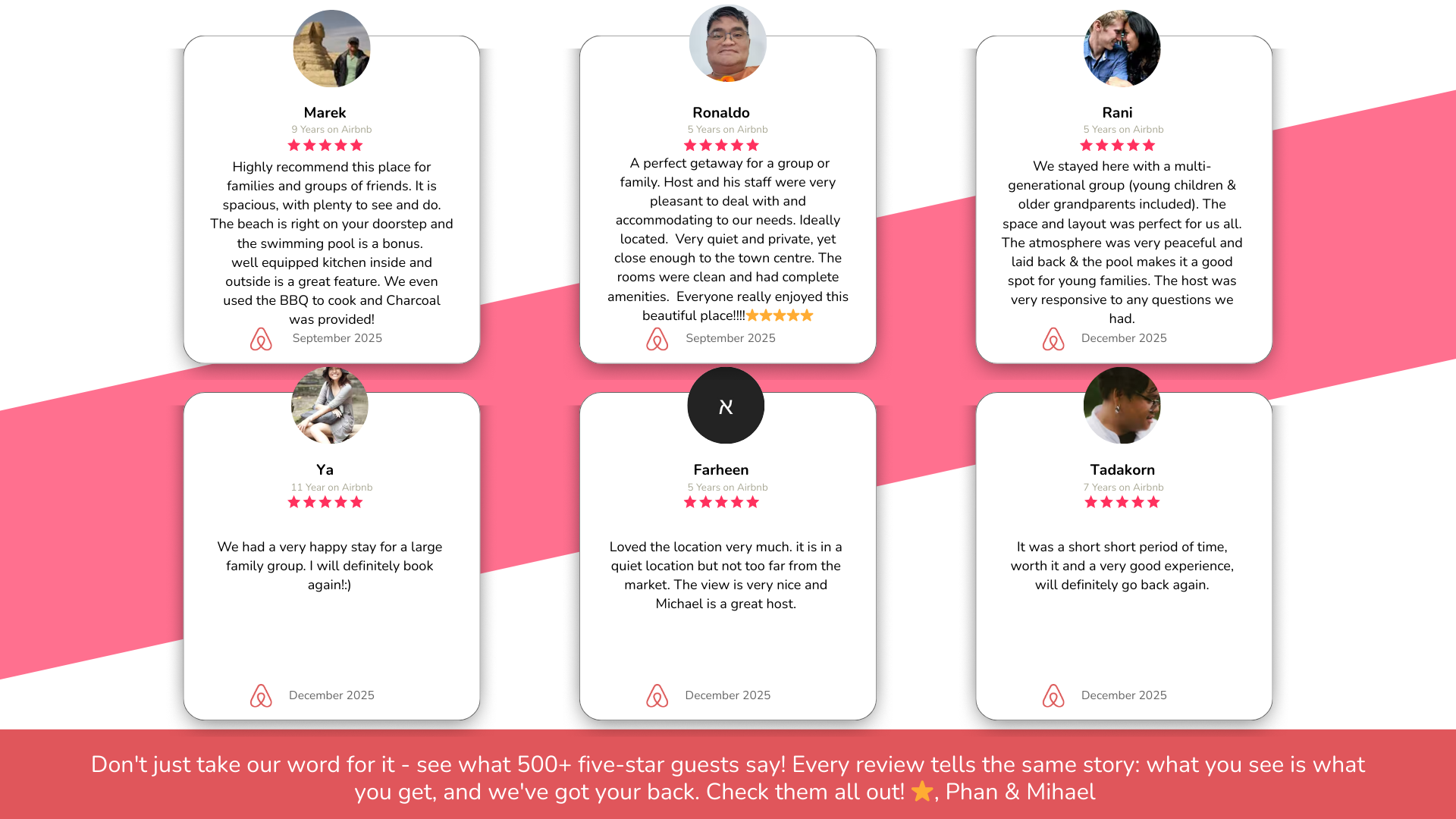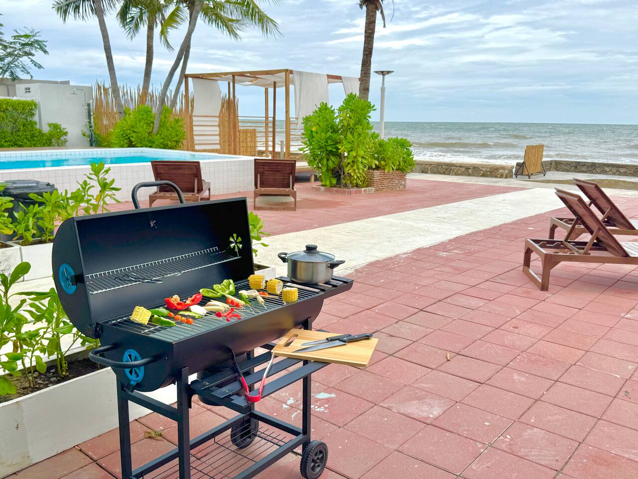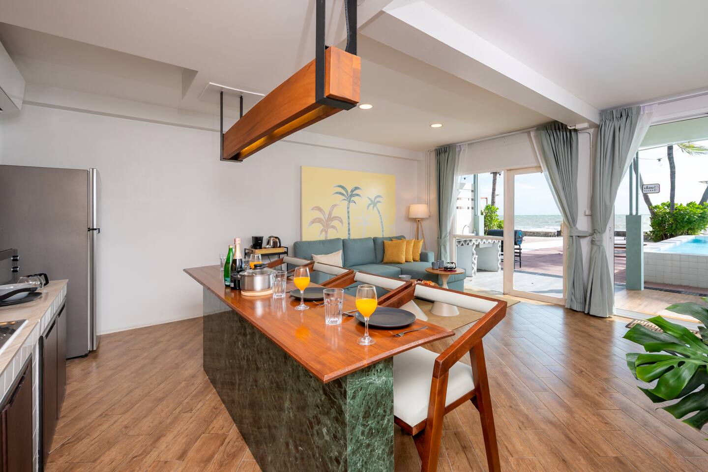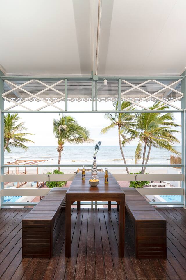 🌊 Live Like a Local, Feel at Home by the Beach Experience authentic beach living in half of our restored 80-year-old Hua Hin beachfront mansion, where colonial charm meets modern comfort. Every bedroom opens to the sea, and the sound of waves sets the rhythm of your stay. Perfect for families and friend groups, your private section spans two floors, featuring ensuite bedrooms, a spacious living room, and an open kitchen — all with beach views and a homelike feel. Enjoy two swimming pools: one beside the sand for relaxed family time, and another elevated for sunset swims. A beach cabana invites yoga, massages, or lazy afternoons by the sea. Our mansion is designed to create a friendly beachside community. Shared spaces include a BBQ kitchen, upper terrace, and pool table — ideal for gathering, chatting, or simply watching the sunset over the waves. 💎 Why Guests Love It 🌊 True Beachfront – Wake up to sea views framed by palms and soft waves 🛏️ Comfort Beyond Sleep – Plush bedding, high & low pillows, all facing the beach 🛋️ Private Living Room – Spacious lounge with panoramic ocean views 🏠 Common Spaces – 2 pools, beach cabana, and sunbeds for laid-back afternoons 👩🍳 BBQ & Cooking – Indoor and outdoor kitchens for easy group meals 🪵 Social Hub – Shared kitchen island & pool table for friendly gatherings 🅿️ Private Parking – Space for multiple cars and vans 📍 Location Highlights 🏰 Royal Palace – 5 min 🌙 Queen’s 19 Rai Night Market – next door 🌙 Hua Hin Night Market – 6 min 🏌️ Royal Hua Hin Golf Course – 10 min 🛒 Villa Market – 6 min | Makro – 7 min 🪁 Market Village – 10 min 🌌 Cicada Market – 15–20 min ☕ Beachfront Cafés & Restaurants – 5 min 🏡 The Space Watch the waves from your living room or bedroom, cook with ocean breezes through the open kitchen, and unwind on your private balcony. Step outside to enjoy shared spaces — take a dip in the pools, prep a BBQ, or play pool as the sun sets over the beach. This setup is perfect for families and groups who love comfort, connection, and the easy rhythm of seaside life. ★ PROPERTY HIGHLIGHTS ★ 🏖️ Beachfront Access • Direct terrace-to-sea connection • Unobstructed views year-round • Beach width changes with the tides — each stage brings its own beauty 🏊 Two Full-Size Pools • One beachfront, one elevated with panoramic views • Equal depth with shallow ends (children must be attended) 🍽️ Kitchens • Private open kitchen with stove, fridge, rice cooker, cookware & utensils • Shared common kitchen for BBQs and group meals 🛏️ Bedrooms & Layout Ground Floor (up to 6 guests) – 1 King, 2 Singles, 1 Queen Sofa Bed Upper Bedroom 1 (up to 4 guests) – 1 King, 1 Queen Sofa Bed (set up on request) Upper Bedroom 2 (up to 6 guests) – 1 Queen, 2 Singles, bathtub with beach view, walk-in closet 🎱 Shared Amenities • 2 swimming pools, cabana, sunbeds • BBQ kitchen & outdoor dining • Pool table with beach view 🐾 Family & Friends Welcome • Designed for family & friend gatherings • Quiet hours at 10 PM – peaceful, not for parties • Pets considered on request ✔ Extras ✅ Free parking for cars/vans ✅ Towels, linens & toiletries provided ✅ Fully stocked kitchenware for all guests 📝 Things to Note 🌴 Private yet central – peaceful beachfront, minutes to town 🌊 Tide changes affect beach width 🦟 Tropical environment – repellent provided ❄️ Keep doors closed to maintain AC & avoid insects 🤝 Quiet hours apply – family stays only 📜 Fully compliant with Thai rental rules 💡 Monthly stays – utility deposit refundable 🏖️ Summary Relax, reconnect, and experience beach living at its most genuine. You’ll have half the mansion to yourself, and shared spaces that make every stay warm and memorable. 👉 Add to wishlist & click ❤️ to book your seaside family retreat today!