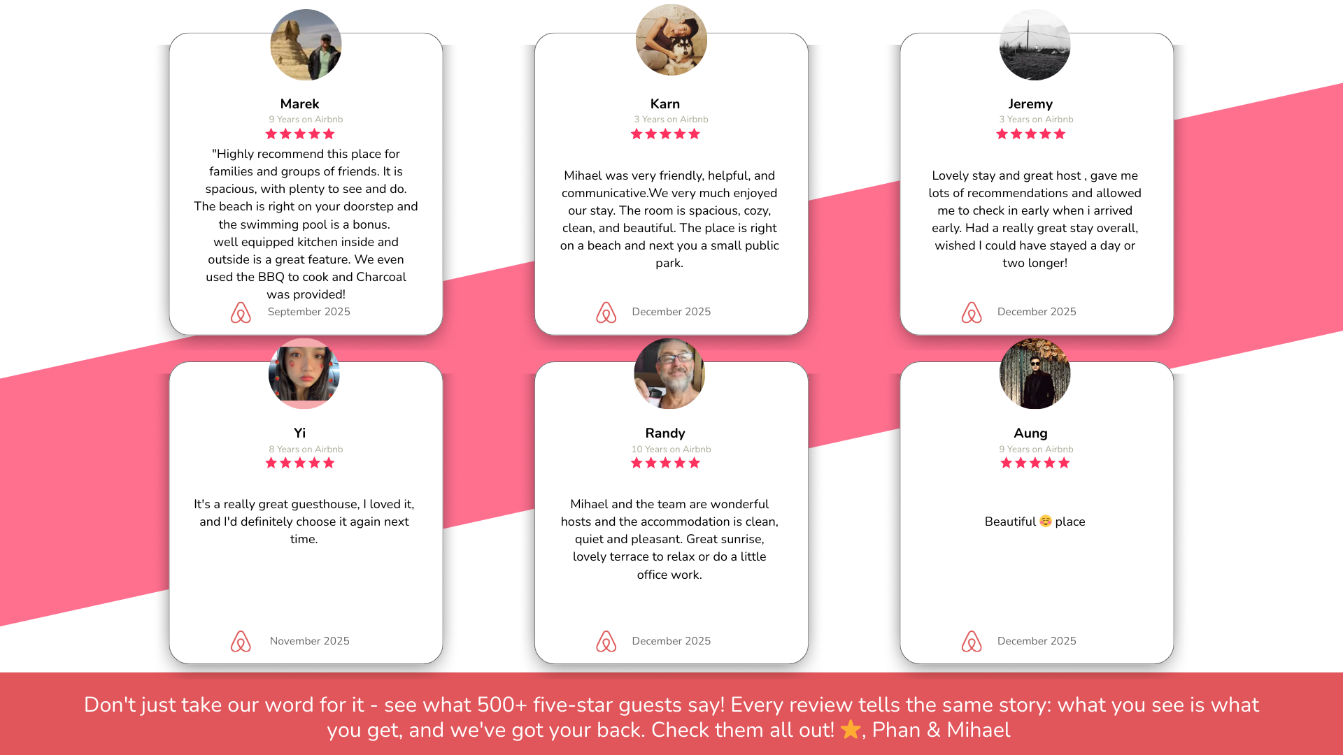 You’ll be staying in a private unit within our beachfront mansion. Please keep voices low after 10 PM and before 9 AM, both inside your unit and in shared areas, so everyone can enjoy the peaceful seaside atmosphere. Thailand is a tropical country, so insects are part of the natural environment. To stay comfortable, please close doors and windows, avoid leaving food out, and dispose of trash in the common bins to prevent mosquitoes or ants. 🌊 Beach Note: The shoreline changes with the tides and seasons — sometimes wide and walkable, other times gently touching the terrace. Each stage has its own charm, and we hope you’ll enjoy the natural rhythm of the sea.