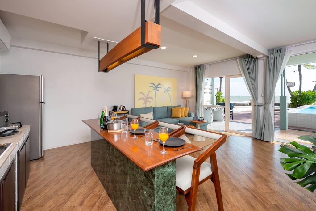 π Feel the Ocean Breeze from Your Living Room and Bedroomπ Stay in one private unit within a restored 80-year-old Hua Hin beachfront mansion, where colonial charm meets modern comfort. The ocean sits right in front, and the rhythm of the waves sets the pace for the day. Enjoy two swimming pools, one beside the beach for relaxed family time, and another elevated with sweeping sea views, perfect for sunset swims or quiet breaks. A beach cabana invites yoga, massages, or lazy afternoons by the sea. Our villa was built to nurture a sense of beachside community. Guests share spaces like a common kitchen for BBQs, an upper terrace with panoramic views of Hua Hinβs shoreline, and a pool table in the common area β peaceful spots to gather, chat, or simply watch the waves reflect the sunset. π Why Guests Love It π True Beachfront β wake up to sunrise views of the ocean, with nothing but sand, sea, and palms outside your window ποΈ Comfort Beyond Sleep β premium bedding with high and low pillows, plus a serene beach view from your bed ποΈ Private Living Room β spacious lounge with full ocean views, perfect for morning coffee or quiet reading π Common Spaces β two pools, a beach cabana, and sunbeds for lazy afternoons π©βπ³ BBQ & Cooking β indoor and outdoor kitchens for easy group meals πͺ΅ Social Hub β communal kitchen island and pool table for laughter and conversation π ΏοΈ Private Parking β space for multiple cars or vans π Location Highlights π° Royal Palace β 5 min π Queenβs 19 Rai Night Market β next door π Hua Hin Night Market β 6 min ποΈ Royal Hua Hin Golf Course β 10 min π Villa Market 6 min | Makro 7 min πͺ Market Village β 10 min π Cicada Night Market β 15β20 min β Beachfront CafΓ©s & Restaurants β 5 min π‘ The Space Watch the beach from your unit while reading, relaxing in bed, or cooking in the open kitchen. Step outside to the common areas β swim in the pools, prep a BBQ, unwind on the terrace, or play a round at the pool table. This unit is ideal for families and couples who love space, comfort, and the feeling of belonging to Hua Hinβs calm coastal life. β PROPERTY HIGHLIGHTS β ποΈ Beachfront Access β’ Direct terrace-to-sea connection β’ Unobstructed ocean views β’ Tide levels vary (low tide = walkable beach; high tide = waterline terrace) π Two Full-Size Pools β’ Equal depth with shallow ends β’ Note: no pool barrier β children must be attended π½οΈ Kitchens (Fully Equipped) β’ Private open kitchen in unit with electric stove, pot and pan, essential seasoning, fridge, rice cooker, bowls and plates, wine glasses and etc,. β’ Shared kitchen for group BBQ and meals ποΈ Bedrooms (for 6 Guests) β’ 1 King bed β’ 2 Singles β’ 1 Queen sofa bed (for 6-guest bookings) β’ Fresh linens + high & low pillows for personal comfort ποΈ Communal Spaces β’ 2 pools, sunbeds, beach cabana β’ Common kitchen & outdoor dining β’ Pool table with beach view πΎ Family & Friends Welcome β’ Designed for family & friend gatherings β’ Quiet hours apply β no wild parties β’ Pets on request β Extras β Free parking for cars / vans β Towels, linens & toiletries provided β Full kitchenware for all guests π Things to Note π΄ Private yet close β beachfront home away from crowds, minutes from town π Beach width varies by tide π¦ Mosquitos common outdoors β repellent provided βοΈ Keep doors closed for AC and bug control π€ Respect quiet hours β family events only π Fully compliant with Thai rental regulations π‘ Monthly stays β utility deposit refunded after use ποΈ Summary Relax, celebrate, and Feel the beach vibe β everythingβs ready, from cookware to coordination. π Add to wishlist and click β€οΈ to book your private beachfront retreat today!