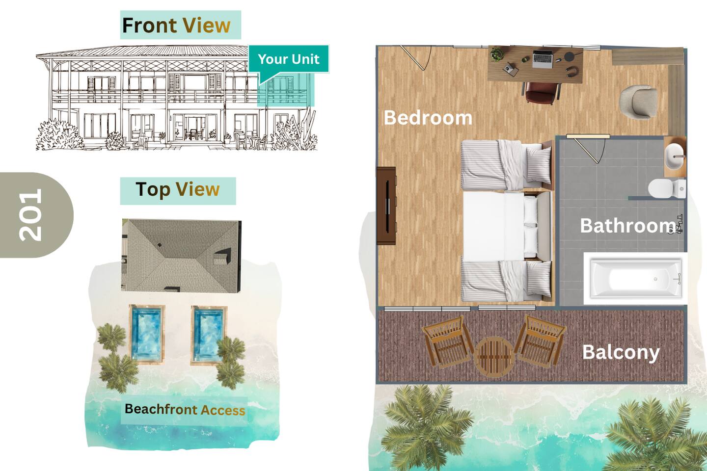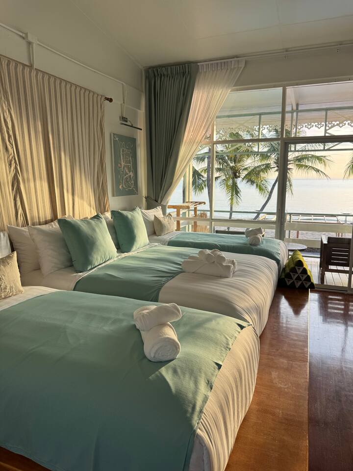 1 Queen, 2 Singles,Sleeps 4. Bathtub, AC, WiFi, Smart TV, Netflix, Coffee/Tea. Shared Kitchen,Shared pools, BBQ, Pool table, Cabana, Laundry, Beach access, Parking. Steps to Night Market. Perfect for family & friends seaside getaway. *Bank transfer available* ห้องชั้นบน วิวทะเล มีอ่างอาบน้ำ &โต๊ะทานข้าวริมระเบียง สําหรับครอบครัว/กลุ่มเพื่อน มีโต๊ะทำงาน 1 Queen, 2 เตียงเดี่ยว พักได้ 4 ท่าน ครัวส่วนกลางอุปกรณ์ครบ &เตาปิ้งย่างBBQ *ติดต่อเราโดยตรง เพื่อรับส่วนลด รับชำระ เงินสด/โอนผ่านบัญชี