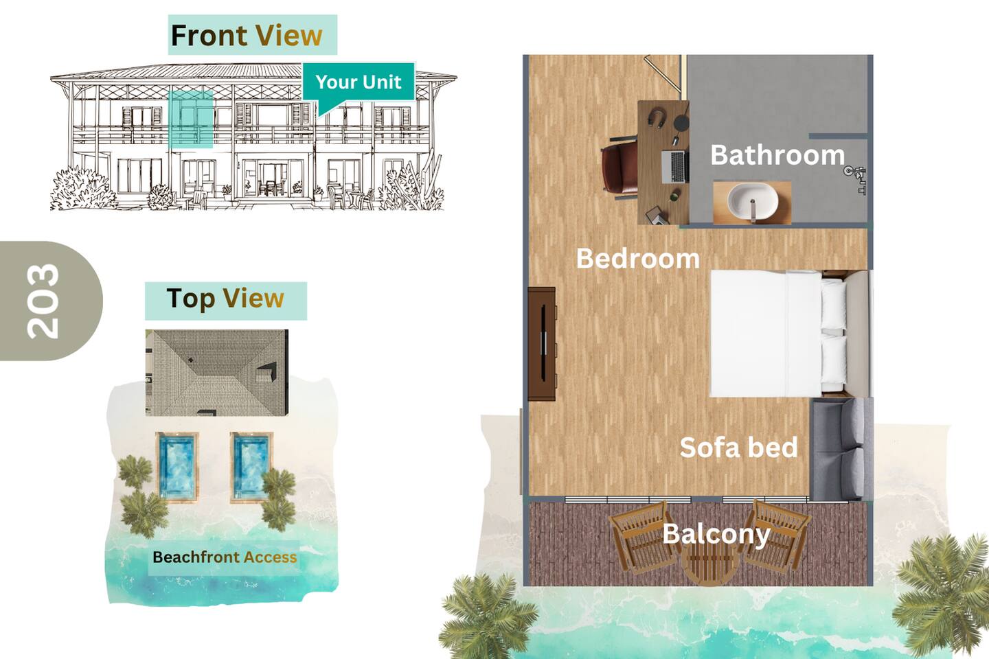 You’ll have full private access to everything inside your unit, including your living area, bedroom, and private balcony overlooking the sea. - The common spaces : two swimming pools, shared kitchen, pool table, beach cabana, and sunbeds are open to all guests. You’re welcome to enjoy them freely while being considerate of others sharing the space. - Quiet hours begin at 10 PM in all common areas. We kindly ask guests to help keep this beachfront home peaceful and respectful of our neighbors, so everyone can enjoy the calm coastal atmosphere. - For safety and maintenance, certain areas remain staff-only, such as storage rooms, the pool pump room, maid quarters, and back-of-house service zones.