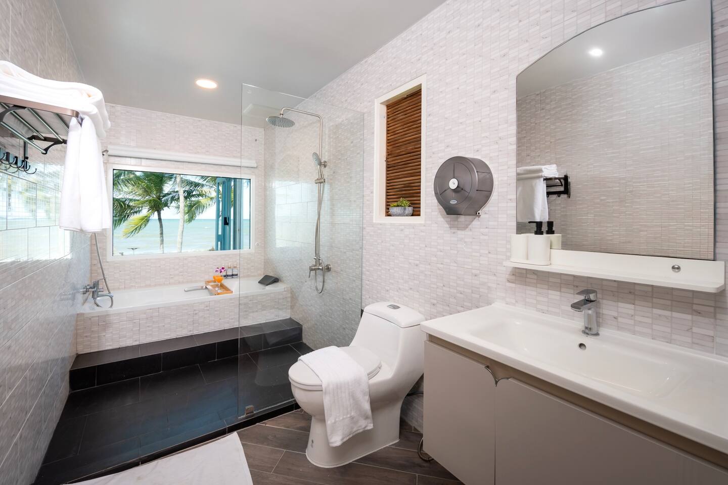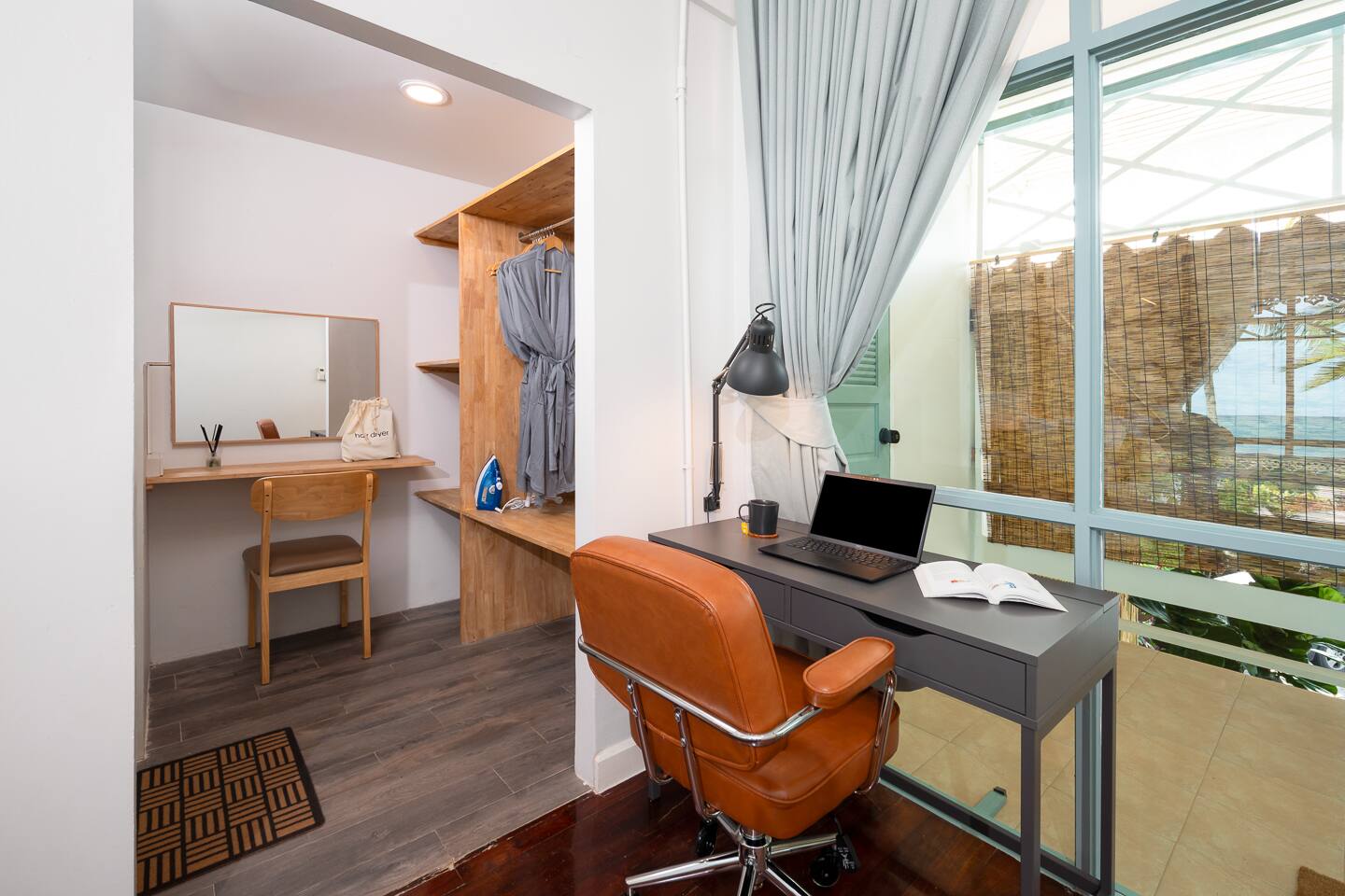 1 Queen, 2 Singles, Sleeps 4. Bathtub, AC, WiFi, Smart TV, Netflix, Coffee/Tea. Shared Kitchen,Pools, BBQ, Pool table, Cabana, Laundry, Beach access, Parking. Steps to Night Market. Perfect for family & friends seaside getaway. *Bank transfer available* ห้องชั้นบนพร้อมอ่างอาบน้ำชมวิวทะเล ดินเนอร์ริมระเบียง ห้องกว้างสําหรับครอบครัว/กลุ่มเพื่อน มุมโต๊ะทำงาน 1 Queen, 2 เตียงเดี่ยว พักได้ 4 ท่าน มีครัวส่วนกลาง&เตาปิ้งย่างBBQ *ติดต่อเราได้โดยตรง เพื่อรับส่วนลด รับชำระ เงินสด/โอนผ่านบัญชี