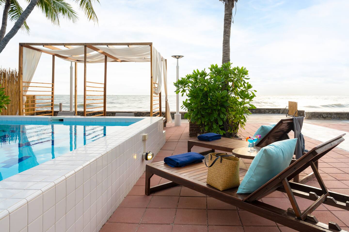 🌊 Feel the Ocean Breeze from Your Living Room and Bedroom🌊 Stay in one private unit within a restored 80-year-old Hua Hin beachfront mansion, where colonial charm meets modern comfort. The ocean sits right in front, and the rhythm of the waves sets the pace for the day. Enjoy two swimming pools, one beside the beach for relaxed family time, and another elevated with sweeping sea views, perfect for sunset swims or quiet breaks. A beach cabana invites yoga, massages, or lazy afternoons by the sea. Our villa was built to nurture a sense of beachside community. Guests share spaces like a common kitchen for BBQs, an upper terrace with panoramic views of Hua Hin’s shoreline, and a pool table in the common area — peaceful spots to gather, chat, or simply watch the waves reflect the sunset. 💎 Why Guests Love It 🌊 True Beachfront — wake up to sunrise views of the ocean, with nothing but sand, sea, and palms outside your window 🛏️ Comfort Beyond Sleep — premium bedding with high and low pillows, plus a serene beach view from your bed 🛋️ Private Living Room — spacious lounge with full ocean views, perfect for morning coffee or quiet reading 🏠 Common Spaces — two pools, a beach cabana, and sunbeds for lazy afternoons 👩🍳 BBQ & Cooking — indoor and outdoor kitchens for easy group meals 🪵 Social Hub — communal kitchen island and pool table for laughter and conversation 🅿️ Private Parking — space for multiple cars or vans 📍 Location Highlights 🏰 Royal Palace – 5 min 🌙 Queen’s 19 Rai Night Market – next door 🌙 Hua Hin Night Market – 6 min 🏌️ Royal Hua Hin Golf Course – 10 min 🛒 Villa Market 6 min | Makro 7 min 🪁 Market Village – 10 min 🌌 Cicada Night Market – 15–20 min ☕ Beachfront Cafés & Restaurants – 5 min 🏡 The Space Watch the beach from your unit while reading, relaxing in bed, or cooking in the open kitchen. Step outside to the common areas — swim in the pools, prep a BBQ, unwind on the terrace, or play a round at the pool table. This unit is ideal for families and couples who love space, comfort, and the feeling of belonging to Hua Hin’s calm coastal life. ★ PROPERTY HIGHLIGHTS ★ 🏖️ Beachfront Access • Direct terrace-to-sea connection • Unobstructed ocean views • Tide levels vary (low tide = walkable beach; high tide = waterline terrace) 🏊 Two Full-Size Pools • Equal depth with shallow ends • Note: no pool barrier – children must be attended 🍽️ Kitchens (Fully Equipped) • Private open kitchen in unit with electric stove, pot and pan, essential seasoning, fridge, rice cooker, bowls and plates, wine glasses and etc,. • Shared kitchen for group BBQ and meals 🛏️ Bedrooms (for 6 Guests) • 1 King bed • 2 Singles • 1 Queen sofa bed (for 6-guest bookings) • Fresh linens + high & low pillows for personal comfort 🛋️ Communal Spaces • 2 pools, sunbeds, beach cabana • Common kitchen & outdoor dining • Pool table with beach view 🐾 Family & Friends Welcome • Designed for family & friend gatherings • Quiet hours apply – no wild parties • Pets on request ✔ Extras ✅ Free parking for cars / vans ✅ Towels, linens & toiletries provided ✅ Full kitchenware for all guests 📝 Things to Note 🌴 Private yet close – beachfront home away from crowds, minutes from town 🌊 Beach width varies by tide 🦟 Mosquitos common outdoors – repellent provided ❄️ Keep doors closed for AC and bug control 🤝 Respect quiet hours – family events only 📜 Fully compliant with Thai rental regulations 💡 Monthly stays – utility deposit refunded after use 🏖️ Summary Relax, celebrate, and Feel the beach vibe — everything’s ready, from cookware to coordination. 👉 Add to wishlist and click ❤️ to book your private beachfront retreat today!