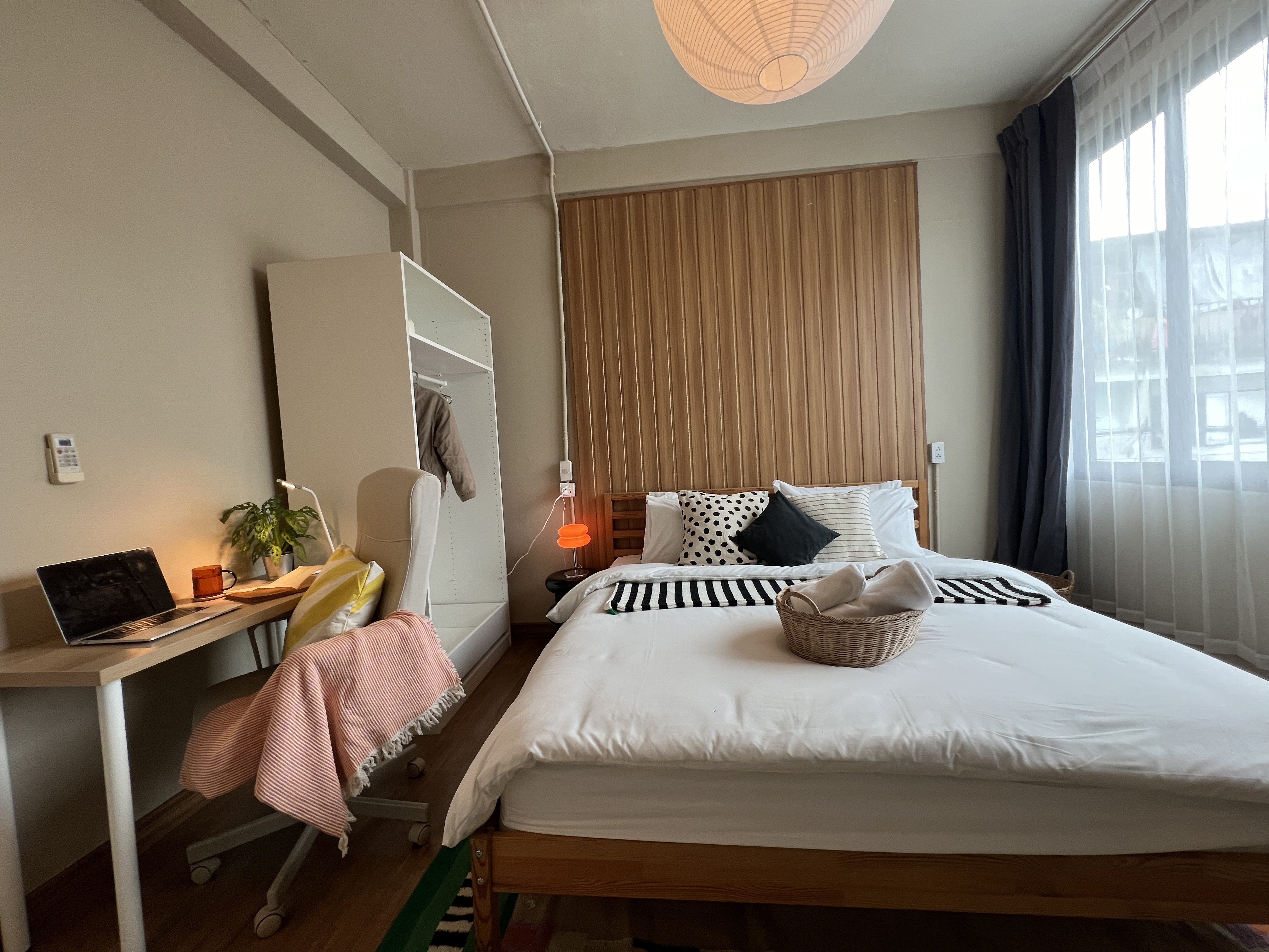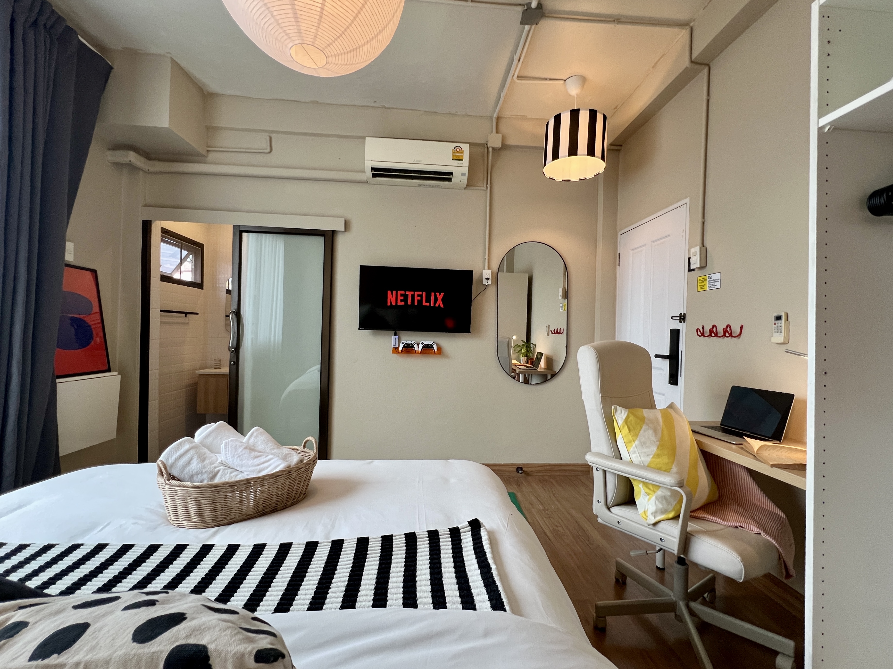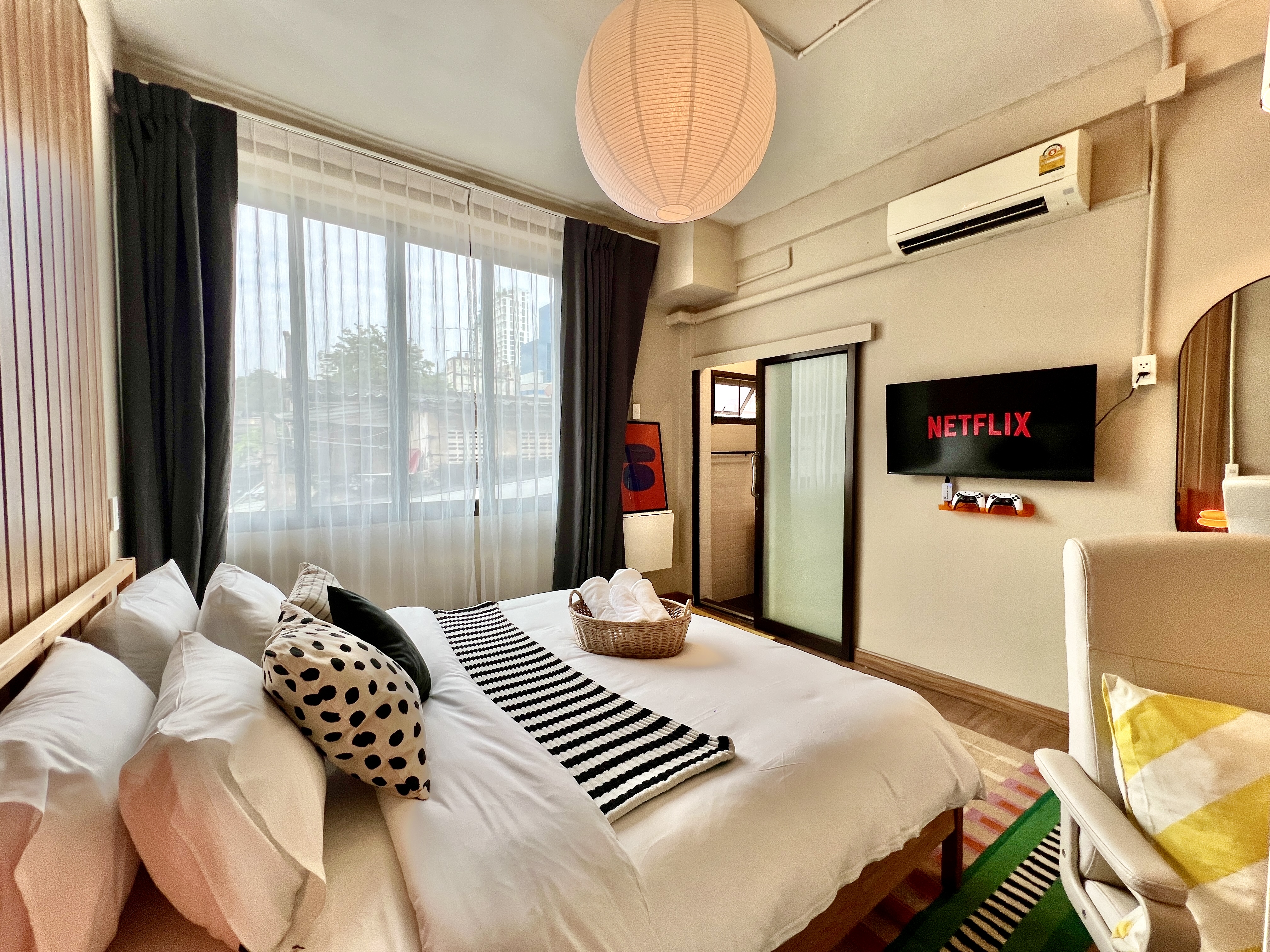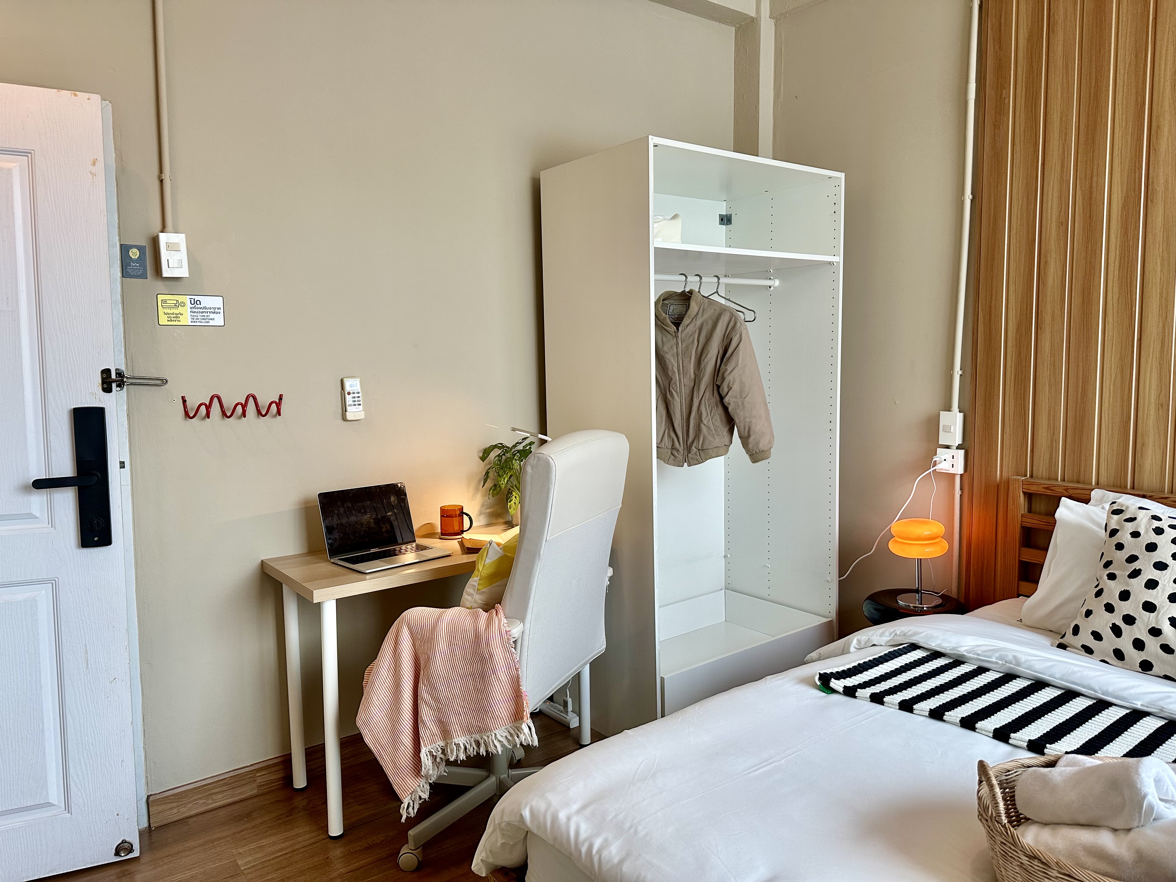 Enjoy a private, comfy and large king-bed room in a peaceful guesthouse tucked in the vibrant Ekkamai neighborhood – perfect for digital nomads, couples, or short-term explorers. 🔑 Self check-in - No lockboxes, no keys! - Check in anytime, with no fuss, just your persona PIN number for the main entrance and your bedroom doors. 💤 Your Private Room Includes: • King-size bed with hotel-quality linens • En-suite bathroom with hot shower, fresh towels & toiletries • Quiet, powerful air conditioning • Smart TV with Netflix • High-speed Wi-Fi + dedicated work desk • Warm lighting and peaceful atmosphere 🍽 Shared Kitchen & Dining Area: • Stove, basic cookware & utensils • Coffee machine ☕ • Fridge + freezer • Dining table for meals or connecting with other travelers • Complimentary laundry service (or use the machines yourself) 🧩 Shared Hallway Lounge (Just Outside Your Door): • Board games and card games to enjoy with your companion or other travelers • Travel guides, Bangkok maps & local recommendations • Space to relax or flip through a book while you plan your day • Designated shoe-removal zone to help keep rooms clean and tidy 🧼 Included Guest Services: • Daily housekeeping (just request it!) • Complimentary laundry – we wash and dry for you • Friendly, responsive host support during your stay 📍 Prime Ekkamai Location – With a Local Twist: Located just steps from BTS Ekkamai and surrounded by amazing cafés, local markets, and shopping malls, you’ll love the convenience of this walkable neighborhood. Please note: Being close to Sukhumvit Road and lively local markets does mean you might hear the vibrant sounds of Bangkok, especially during peak hours. Most guests find it manageable, and earplugs are available for light sleepers. But for travelers who want to immerse themselves in real Bangkok life, this spot offers the perfect balance of local flavor and central convenience — all with quick access to the BTS, shopping, nightlife, and street food. 🎒 Optional Extras: • Early check-in / Late check-out (when available) • Airport pick-up & drop-off • Secure luggage storage for early arrivals or late departures