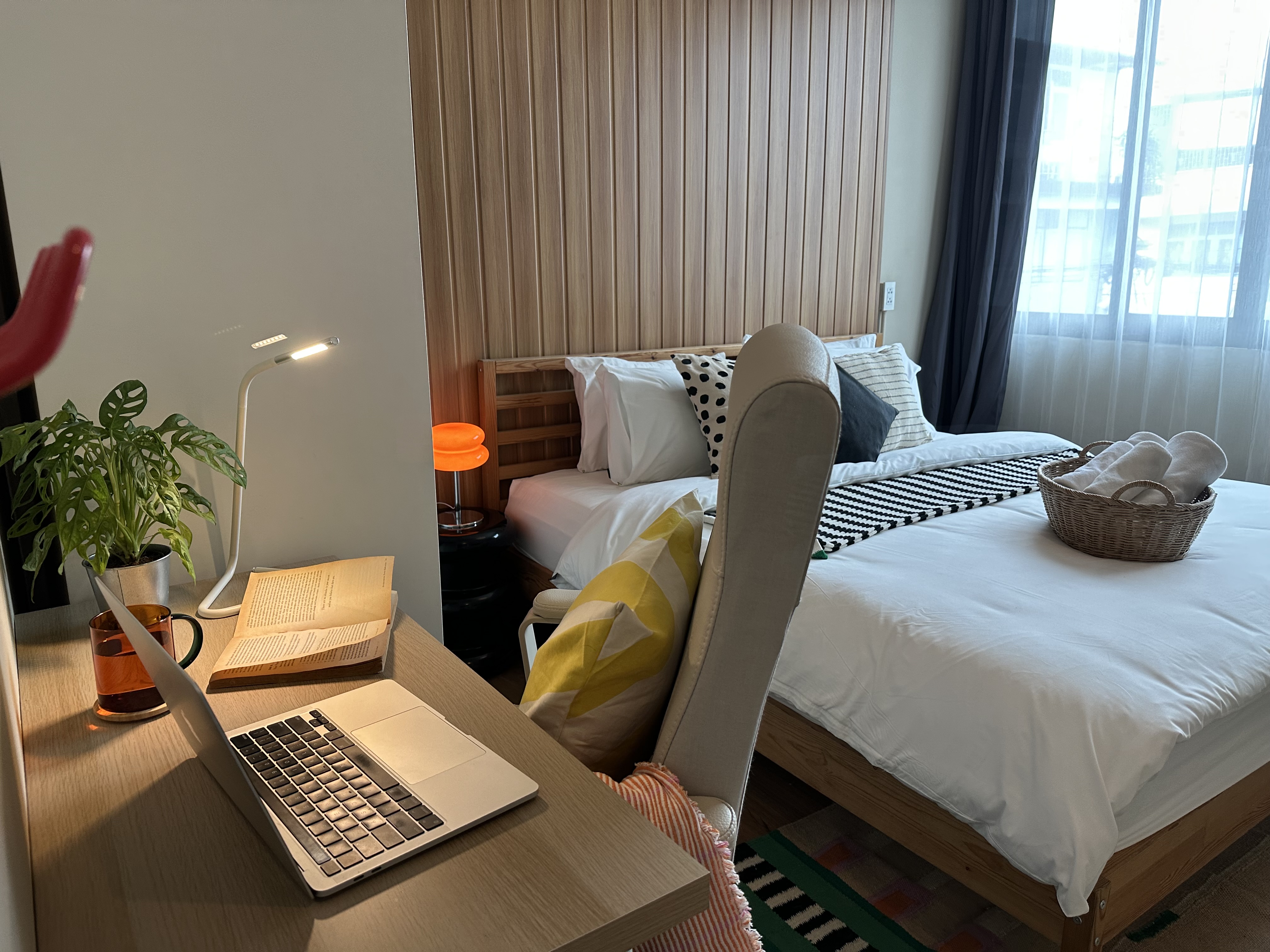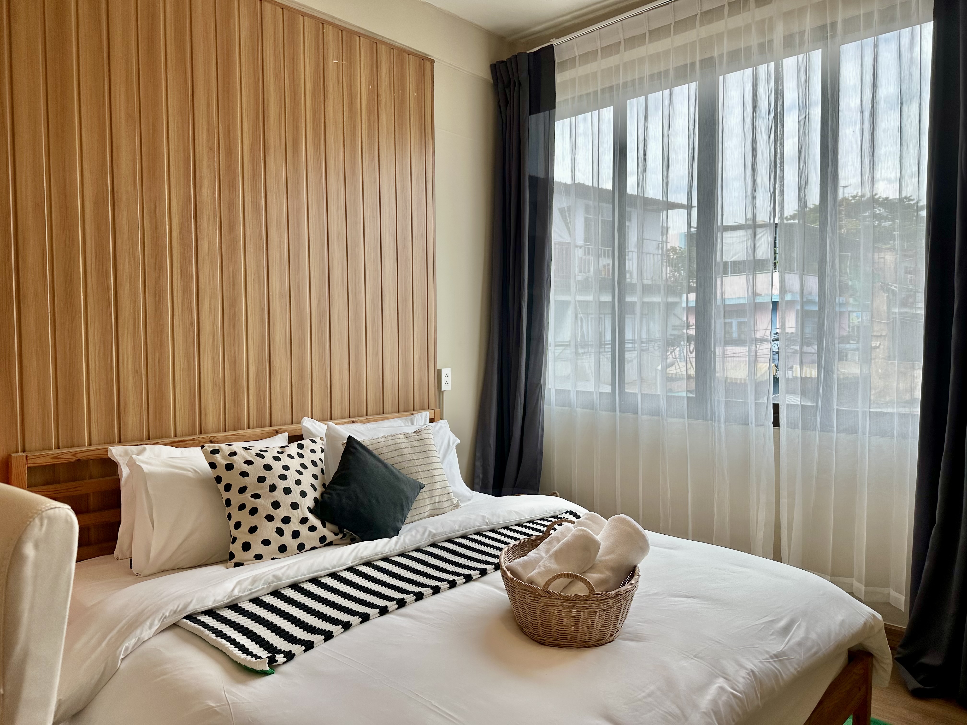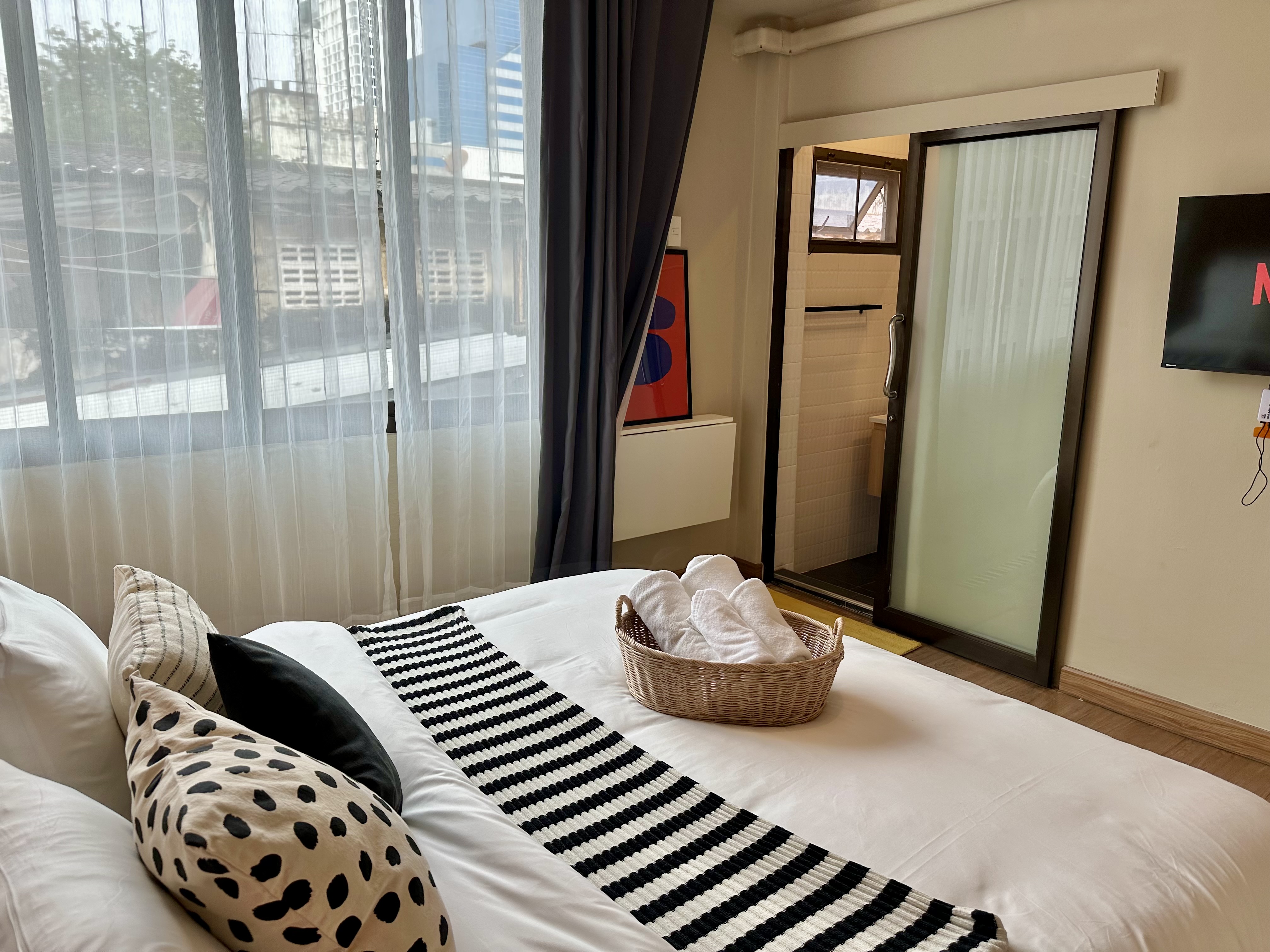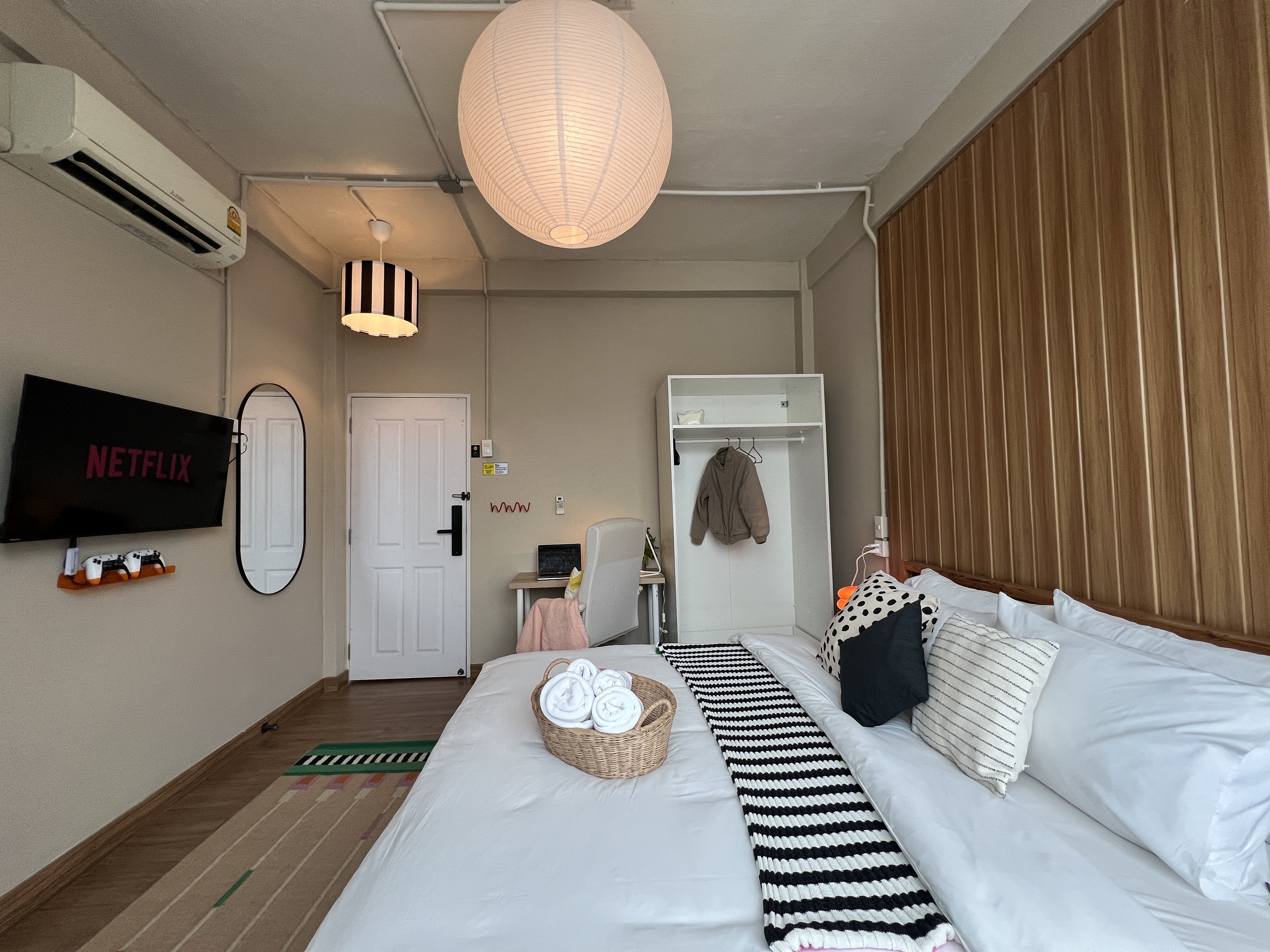 Enjoy a private, comfy and large king-bed room in a peaceful guesthouse tucked in the vibrant Ekkamai neighborhood – perfect for digital nomads, couples, or short-term explorers. 🔑 Self check-in - No lockboxes, no keys! - Check in anytime, with no fuss, just your persona PIN number for the main entrance and your bedroom doors. 💤 Your Private Room Includes: • King-size bed with hotel-quality linens • En-suite bathroom with hot shower, fresh towels & toiletries • Quiet, powerful air conditioning • Smart TV with Netflix • High-speed Wi-Fi + dedicated work desk • Warm lighting and peaceful atmosphere 🍽 Shared Kitchen & Dining Area: • Stove, basic cookware & utensils • Coffee machine ☕ • Fridge + freezer • Dining table for meals or connecting with other travelers • Complimentary laundry service (or use the machines yourself) 🧩 Shared Hallway Lounge (Just Outside Your Door): • Board games and card games to enjoy with your companion or other travelers • Travel guides, Bangkok maps & local recommendations • Space to relax or flip through a book while you plan your day • Designated shoe-removal zone to help keep rooms clean and tidy 🧼 Included Guest Services: • Daily housekeeping (just request it!) • Complimentary laundry – we wash and dry for you • Friendly, responsive host support during your stay 📍 Prime Ekkamai Location – With a Local Twist: Located just steps from BTS Ekkamai and surrounded by amazing cafés, local markets, and shopping malls, you’ll love the convenience of this walkable neighborhood. Please note: Being close to Sukhumvit Road and lively local markets does mean you might hear the vibrant sounds of Bangkok, especially during peak hours. Most guests find it manageable, and earplugs are available for light sleepers. But for travelers who want to immerse themselves in real Bangkok life, this spot offers the perfect balance of local flavor and central convenience — all with quick access to the BTS, shopping, nightlife, and street food. 🎒 Optional Extras: • Early check-in / Late check-out (when available) • Airport pick-up & drop-off • Secure luggage storage for early arrivals or late departures