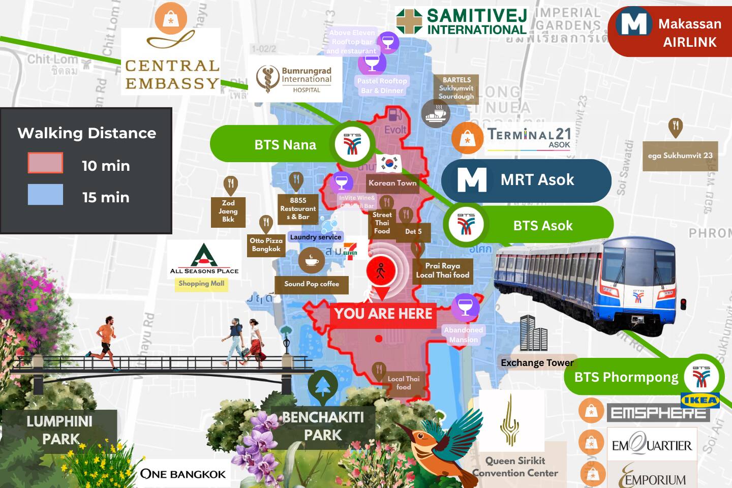 A Green Oasis in the Heart of the CityEasy access to anywhere with BTS NaNa or Enjoy nature with direct access to Benjakitti Park within walking distance . This area is vibrant fusion of cultures and urban energy. From locals to expats, and even a nearby Koreatown, the area caters to all your cravings whether you're after authentic cuisine, nightlife, or quiet cafés. Staying healthy is easy too, with plenty of spas, gyms, and wellness spots just around the corner to keep you feeling your best throughout your stay. ✨ Why you’ll love staying here ✅ Prime location : walk to BTS Nana in minutes ✅ A green oasis : enjoy rare direct walking access to Benjakitti Park through a quiet back alley, perfect for morning jogs, bike rides, or peaceful sunset strolls 🌳 ✅ Endless options : cafés, bars, restaurants & street food all around ✅ Shop till you drop : near Terminal 21, Central Embassy & EmQuartier malls ✅ Convenient & safe : 24/7 convenience stores 7-Eleven, Lotus’s Go Fresh, and local grocery shops just steps from your door. ✅ Well-connected : easy access to the airport, Siam, and Chatuchak Market. Thanks to its prime location on the BTS Nana station, commuting around Bangkok is seamless. The area is lively, safe, and well-connected perfect for travelers wanting to experience the real Bangkok with ease. Whether you're here for leisure, business, or exploration, Nana offers a perfect blend of excitement, comfort, and cultural discovery right at your doorstep.