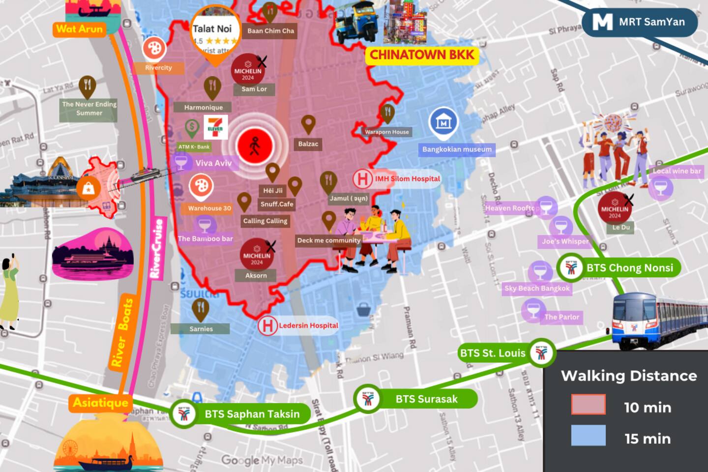 Getting around BTS Skytrain: Use BTS Saphan Taksin (S6). From there, you can connect across the city quickly without traffic. Easy for Siam, Asok, and Chatuchak connections. Fast river boats: From Sathorn/Si Phraya piers, hop on the Chao Phraya Express or ICONSIAM/blue flag boats. They’re frequent, scenic, and often faster than roads. Boats to temples: For Wat Arun (Temple of Dawn), cross-river ferries run every few minutes from Tha Tien/Wat Pho side. For Wat Pho and the Grand Palace, ride to Tha Tien or Tha Chang piers and walk a few minutes—simple, signed, and cheap.